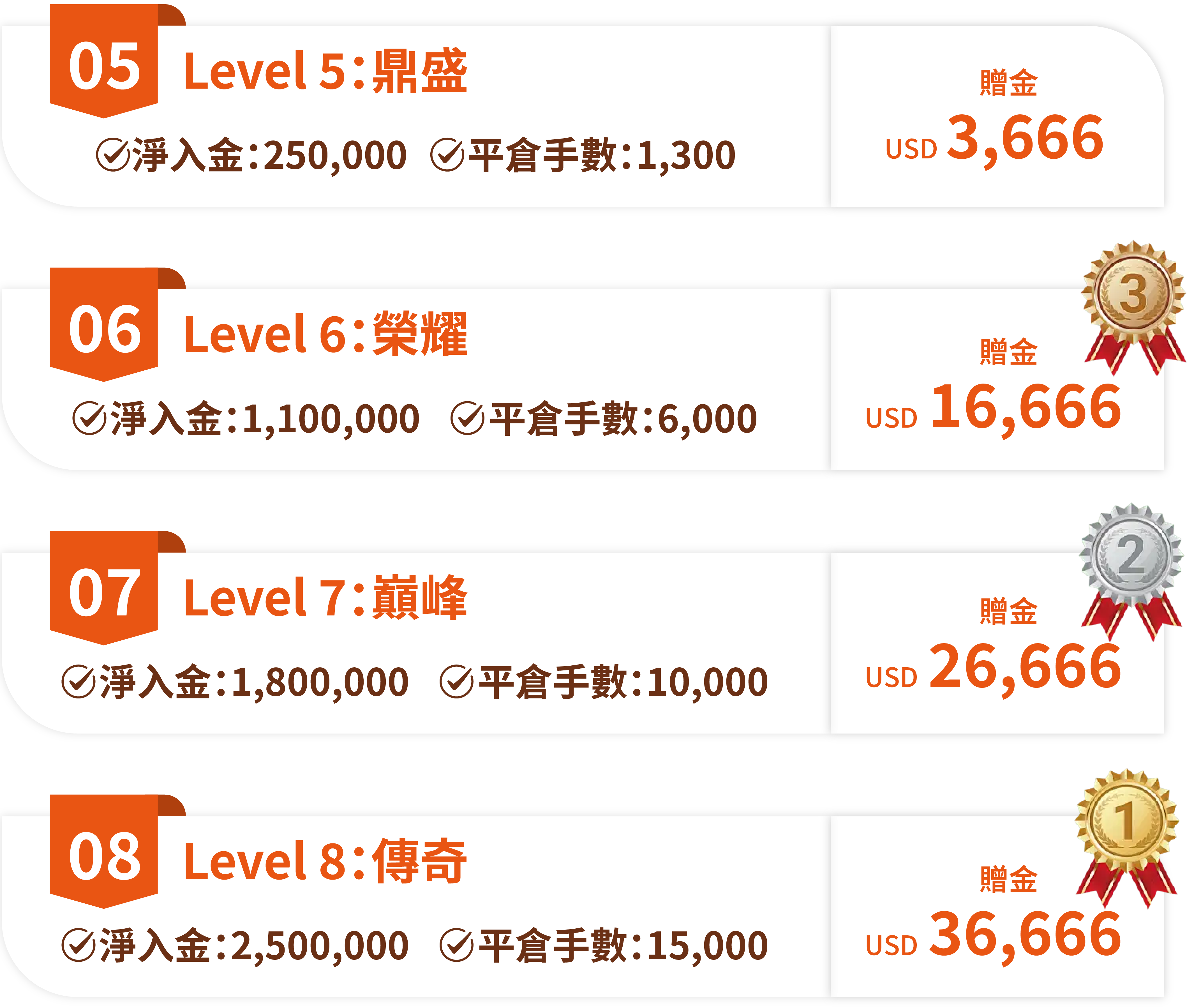 從啓航到傳奇,八大層級逐級解鎖!活動期間內,達成指定淨入金與平倉手數,即可解鎖對應層級贈金獎勵,最高可享 $36,666贈金回饋。