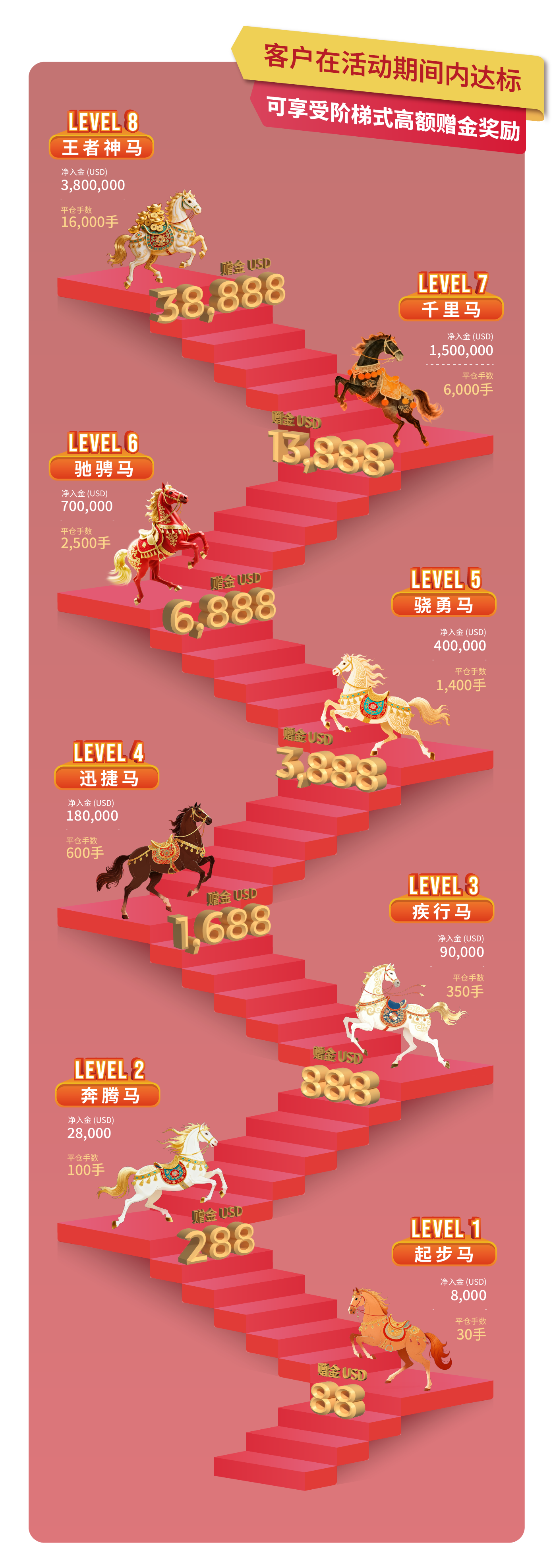 - 活动内容:客户在登记活动后,活动期间内的净入金和平仓手数(美股产品不计算在内)达到相应要求,即可获得该层级对应的赠金。