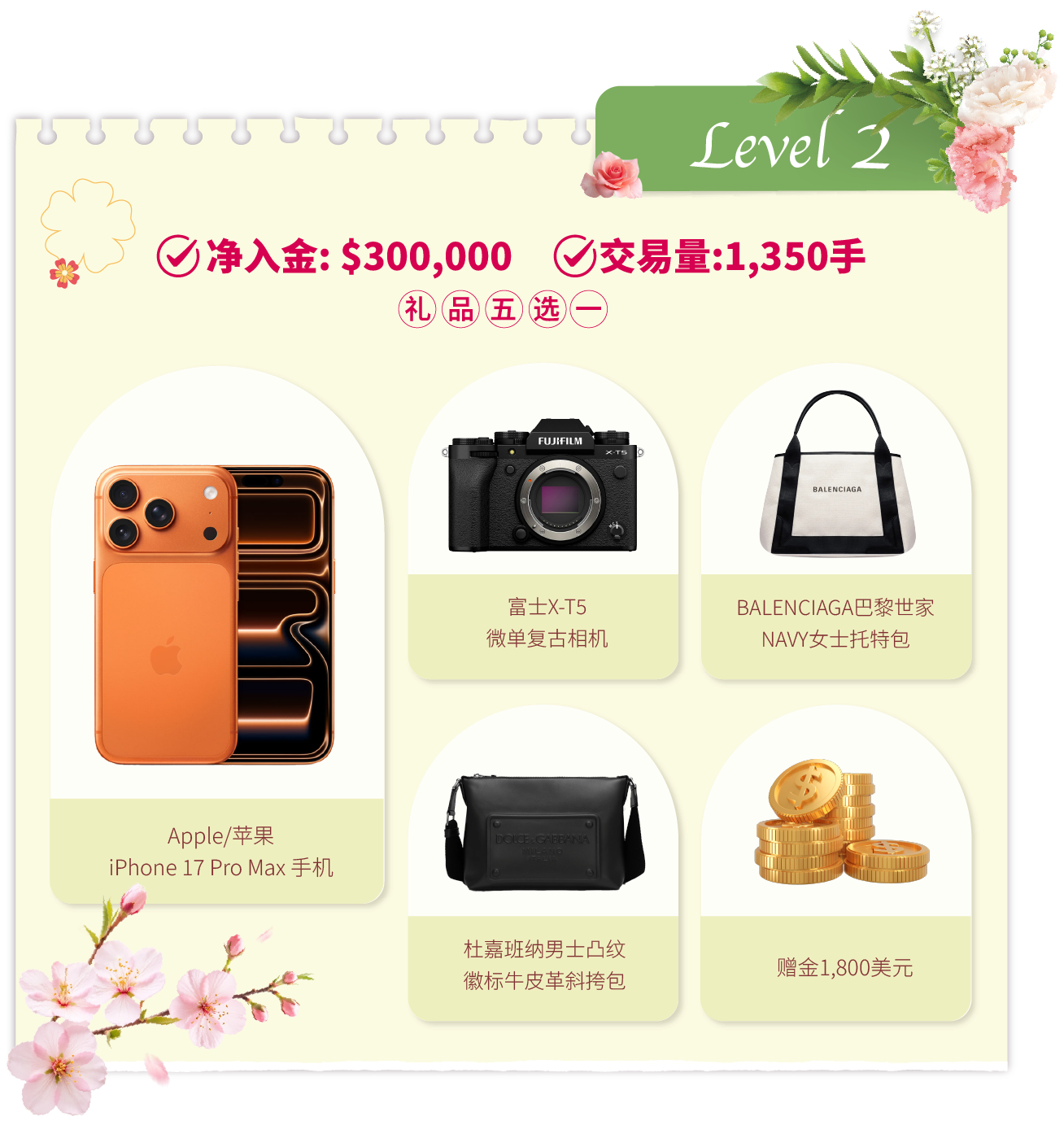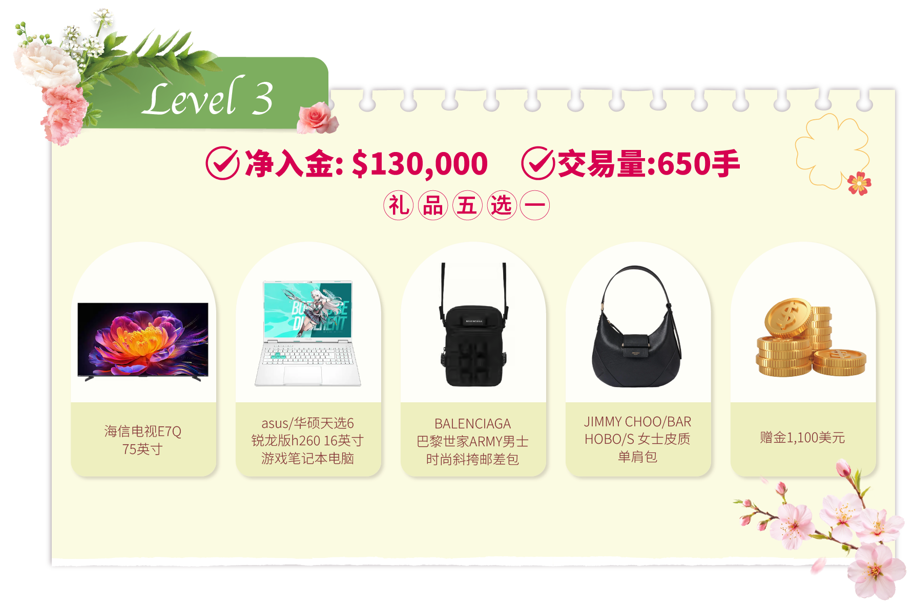 • 活动结束后的奖品发放流程:统计结果后,我们将安排专人联系各达标客户。联系时会提供一个表单链接给获奖者填写。该表单用于收集奖品选择及收货资料。达标客户需在2026年4月20日前提交表单。