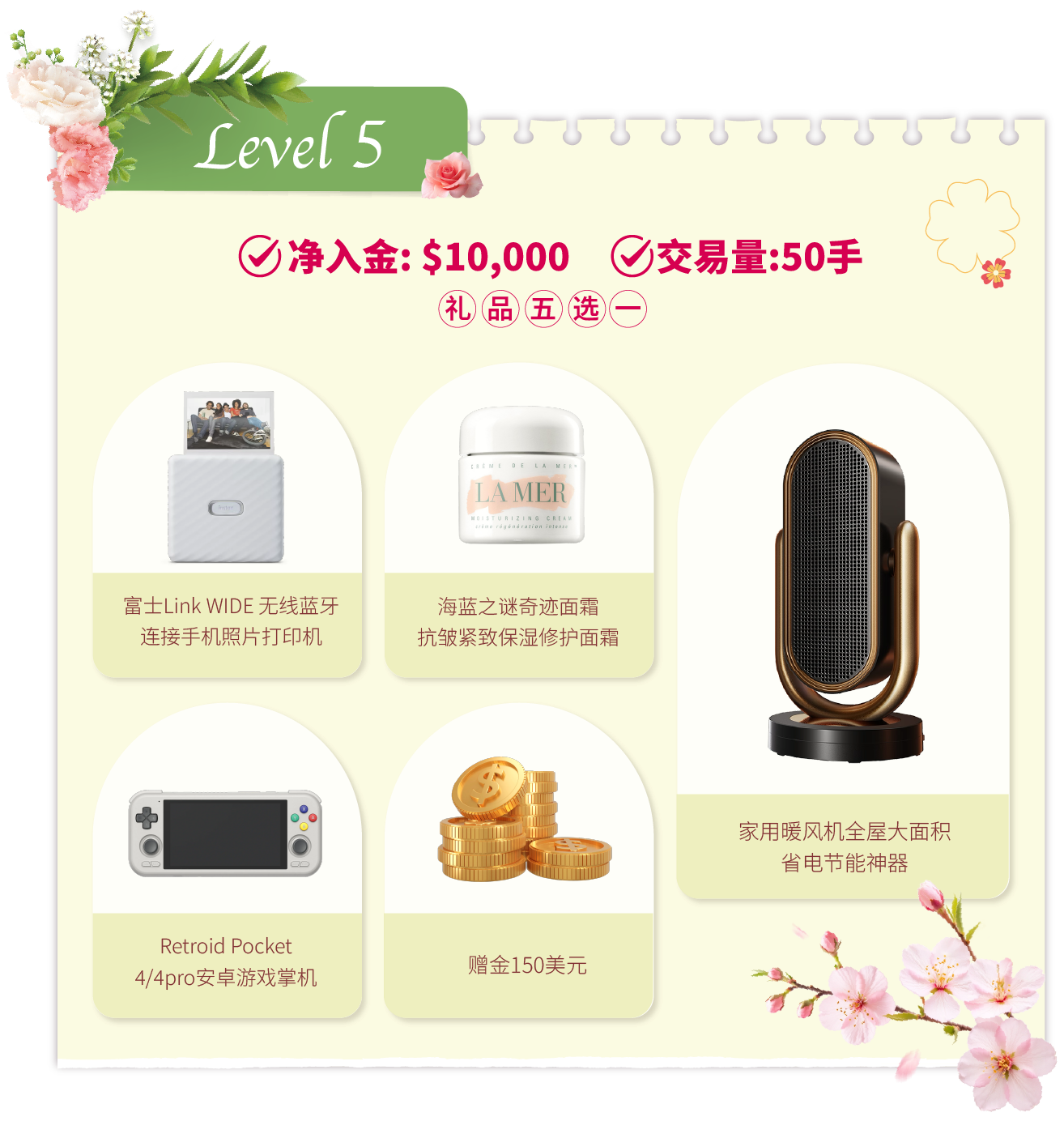 在活动期间内,客户的净入金和平仓手数(美股产品不计算在内)达到相应要求,即可在该层级的五件精选礼品中任选其一。若通过亨达APP完成交易,平仓手数将享有三倍累计计算,助您更快达成目标!